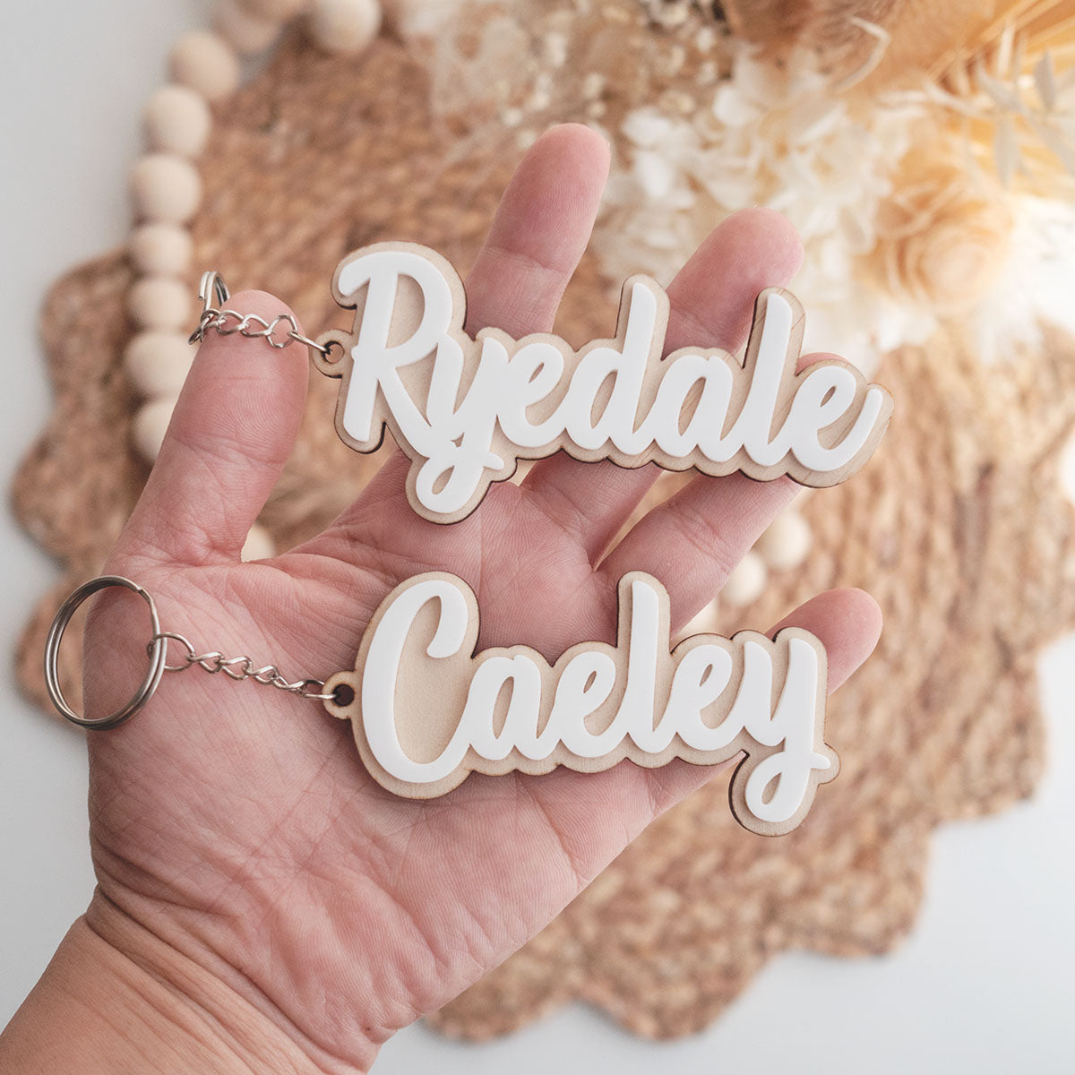 - You also have the option of including a bag tag, which features a wooden backing and a white acrylic top, similar to the name design in script.