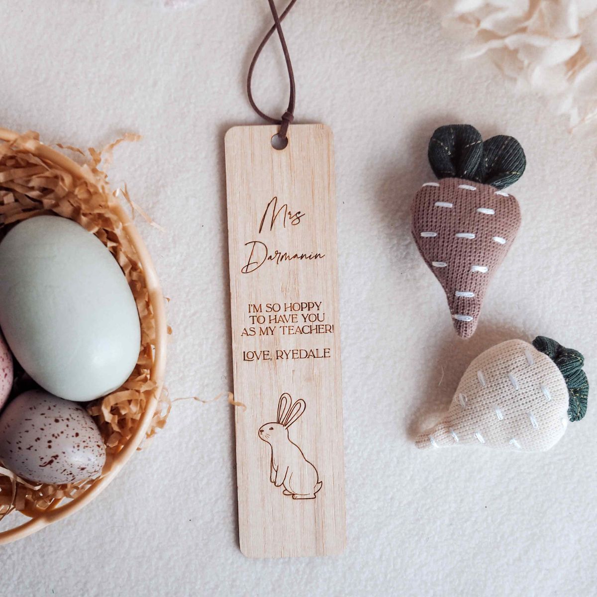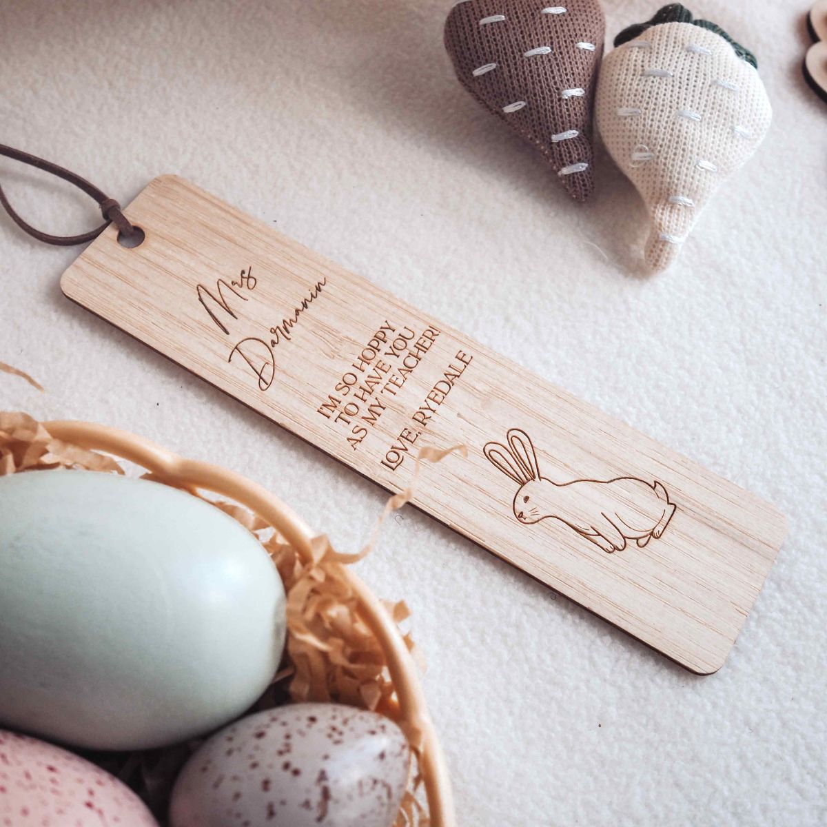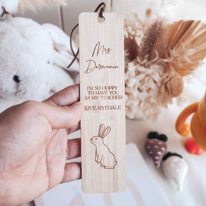 Celebrate Easter with a beautifully engraved wooden bookmark featuring an adorable bunny design, perfect as a personalised gift for teachers, mums, book lovers, and friends. Thoughtfully crafted from premium wood, this bookmark adds a touch of charm to every reading moment.