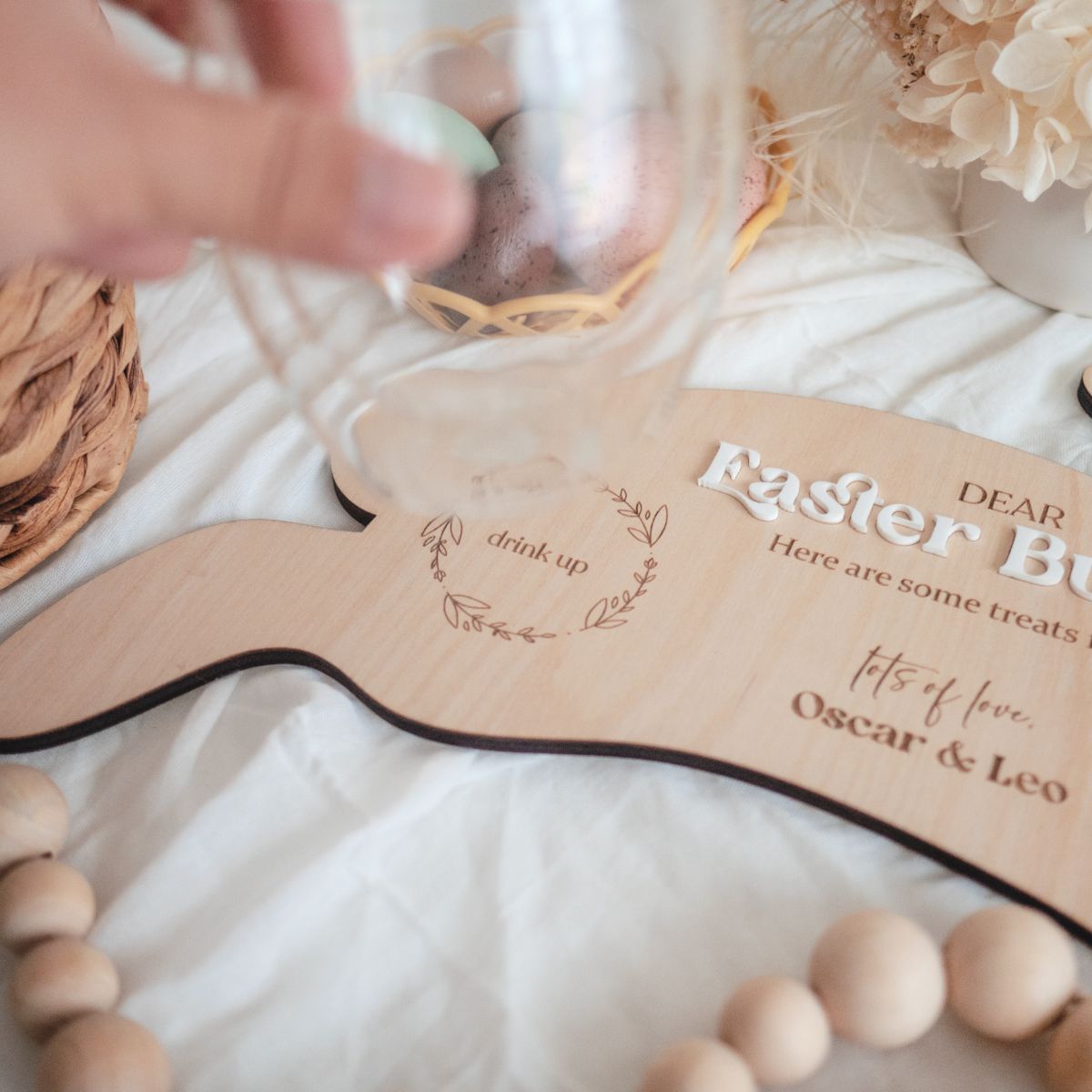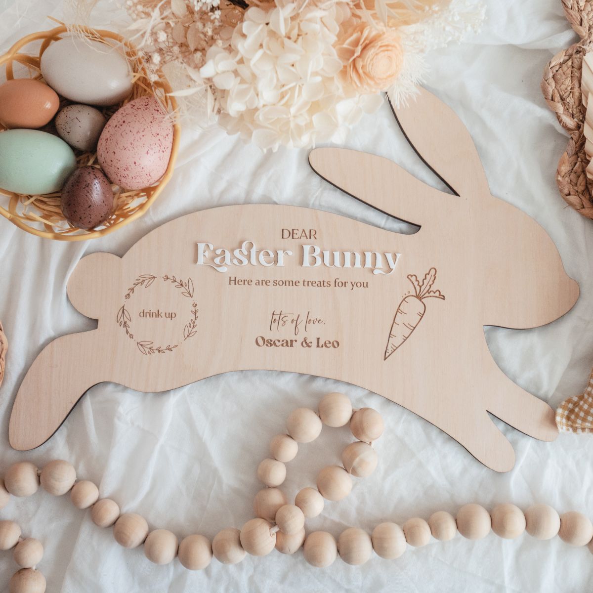 Welcome the Easter Bunny in style with your very own Personalised Easter Treat Board or Bunny Tray. - the ideal way to start a cherished family tradition. Made of durable timber, this board is engraved with custom details that will make it a cherished keepsake for years to come. Personalize with your children's names or your family surname for a special touch.