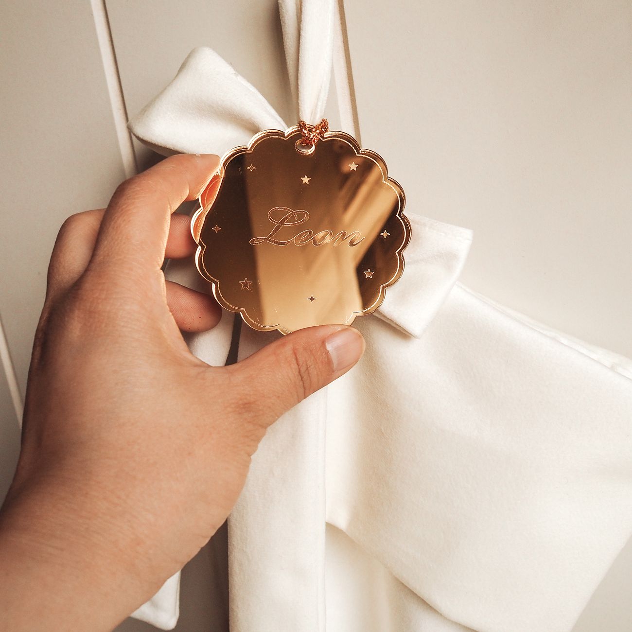 Add a hint of luxury to your Christmas décor with our Personalised Gold Mirror Scallop Tag — a timeless accent that pairs beautifully with our velvet stockings, bows, and keepsake gifts.